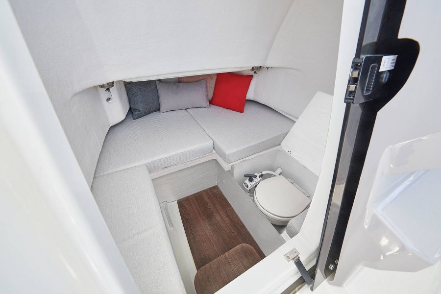 The optional leaning post in the aft cockpit, integrates an exterior galley or a large live well. The wide bench seating forward of the console is a great place to relax whilst watching the sea. The forward cockpit can be transformed into a sundeck. The interior of the console is furnished: providing the opportunity to spend a night on board then prepare breakfast in the open air in the morning.