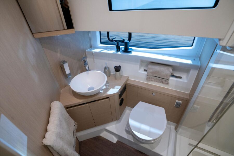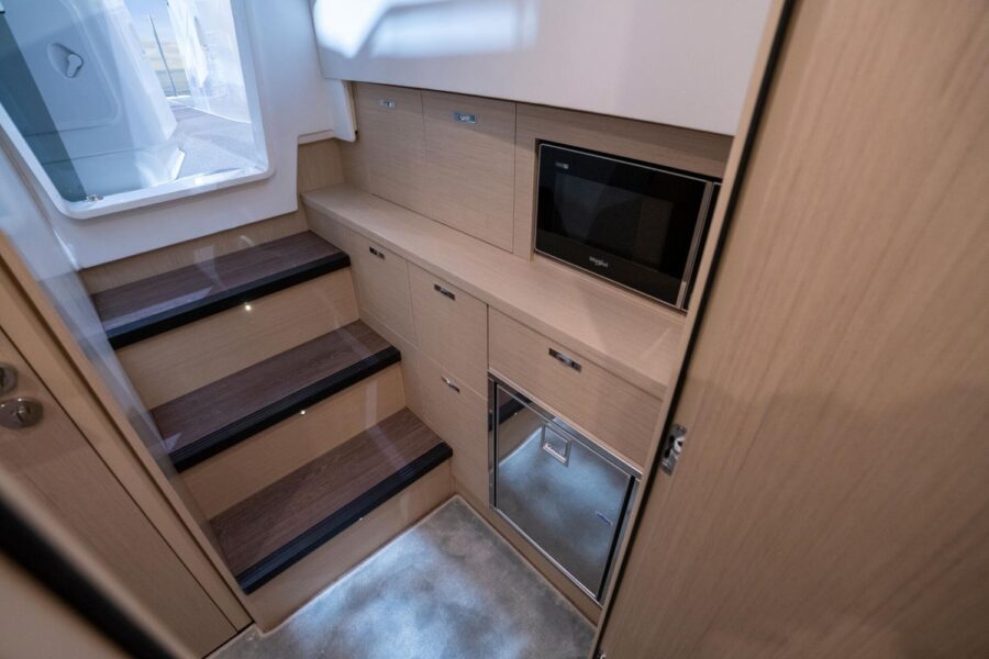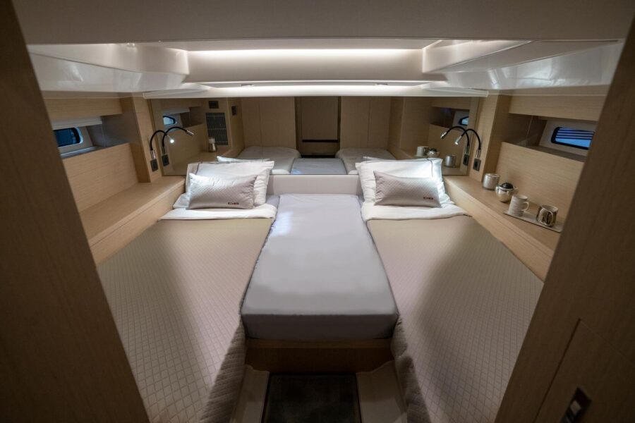 The interior uses fine materials, includes thoughtful details and provides a warm atmosphere with lots of natural light through vast hull windows.