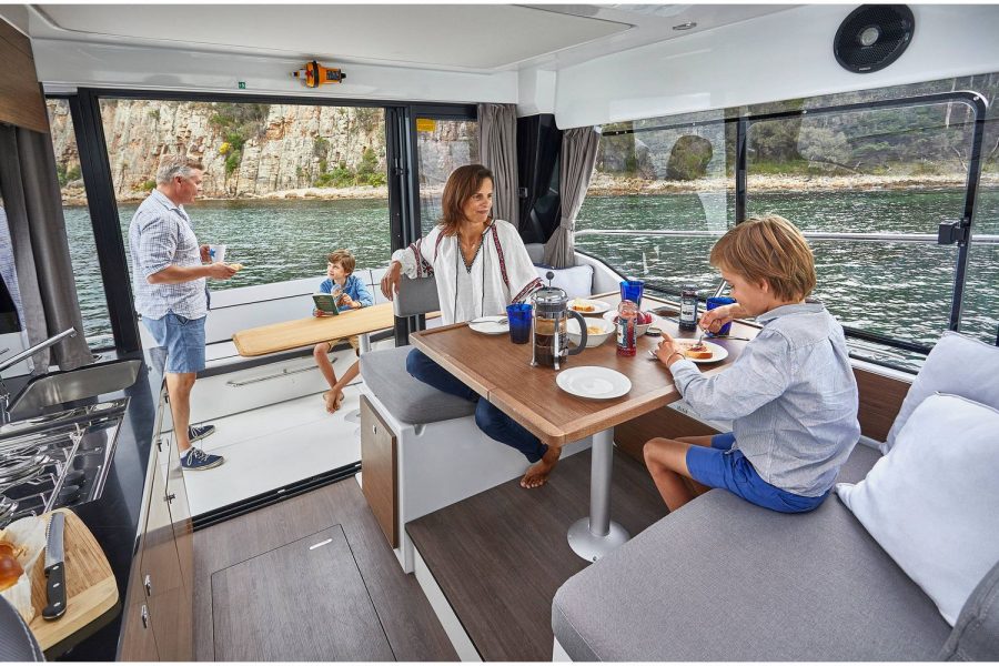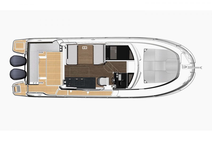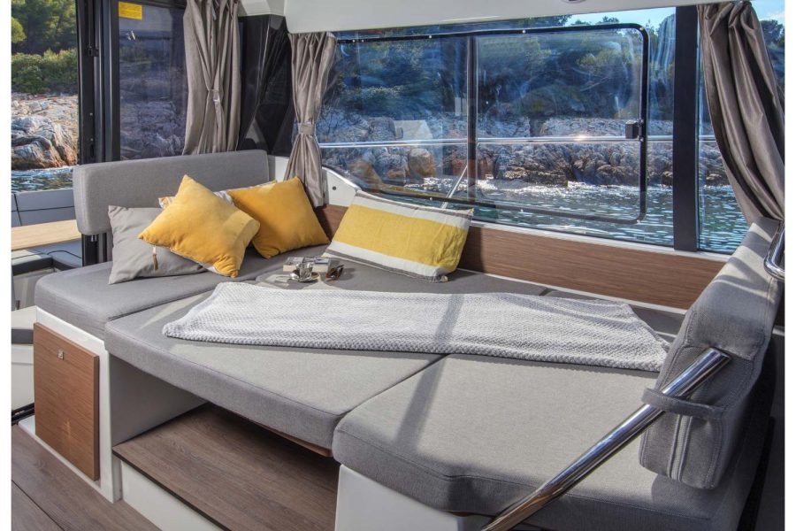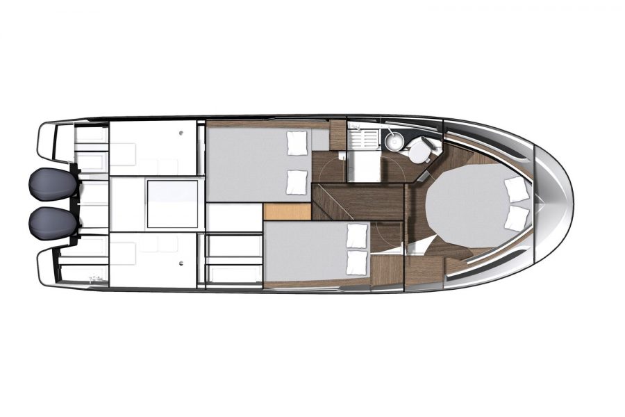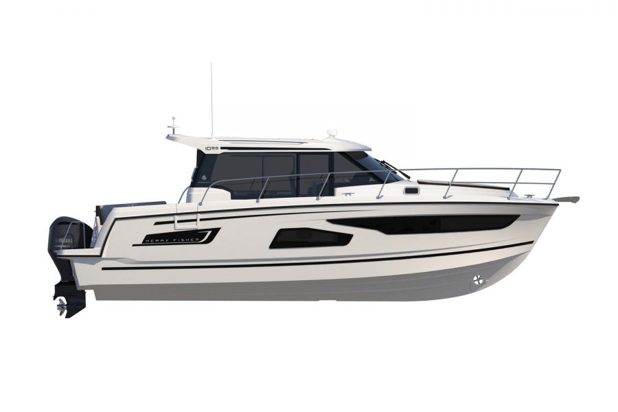 The Merry Fisher 1095 is the second largest boat of the Merry Fisher family from Jeanneau. Designed for cruising – a true weekender; benefiting from an incredible volume of living space on board. This boat has six / eight berths (in two or three cabins + wheelhouse berth conversion), plus marine toilet in separate compartment + separate shower + electric pressurised heated water as standard. She is CE category B for 8 people offshore and C for 10 people inshore. The Merry Fisher 1095 takes full advantage of the world of outboard engines; which had previously seemed impractical for boats over 10m. This new combination provides ease of use while guaranteeing exceptional performance. The Merry Fisher 1095 was the initially the flagship of the range, with a hull specifically designed for this type of propulsion and power. On the exterior, every detail has been carefully considered for safety, comfort and relaxation. A sliding side door, 2x wheelhouse roof hatches, large forward sundeck, recessed side deck and side access gate allow good movement and access aboard. According to your needs, the co-pilot bench seat can pivot to create a wide space for entertaining in the cockpit. At night, the bench seat can also be transformed into a berth.