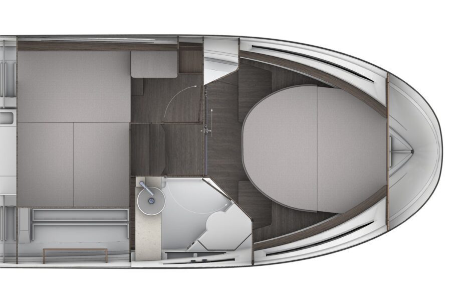 The Merry Fisher 895 Series 2 is a fantastic weekend cruiser with lots of space and large windows for a bright interior. This boat has six berths (in 2 cabins + wheelhouse berth conversion), plus marine toilet in separate compartment, electric pressurised water as standard and full galley. The exterior space is just as appealing – with an L or U shape cockpit saloon with arm rests, plus optional forward sun deck and aft sun deck. Featuring an opening side gate on the starboard side – for easy access to pontoons and the water, plus a recessed side deck for ease and safety when moving around the boat. The original Merry Fisher 895 was introduced in 2017 and has sold over 1,800 boats worldwide. In 2023, it was upgraded to the Series 2. It offers twin engines – up to 2x 250hp – with a new hull design to give great comfort, performance and manoeuvrability with twin outboards – plus larger hull windows. The front cockpit features a sun lounger with face to face seating – with an optional infill cushion.
